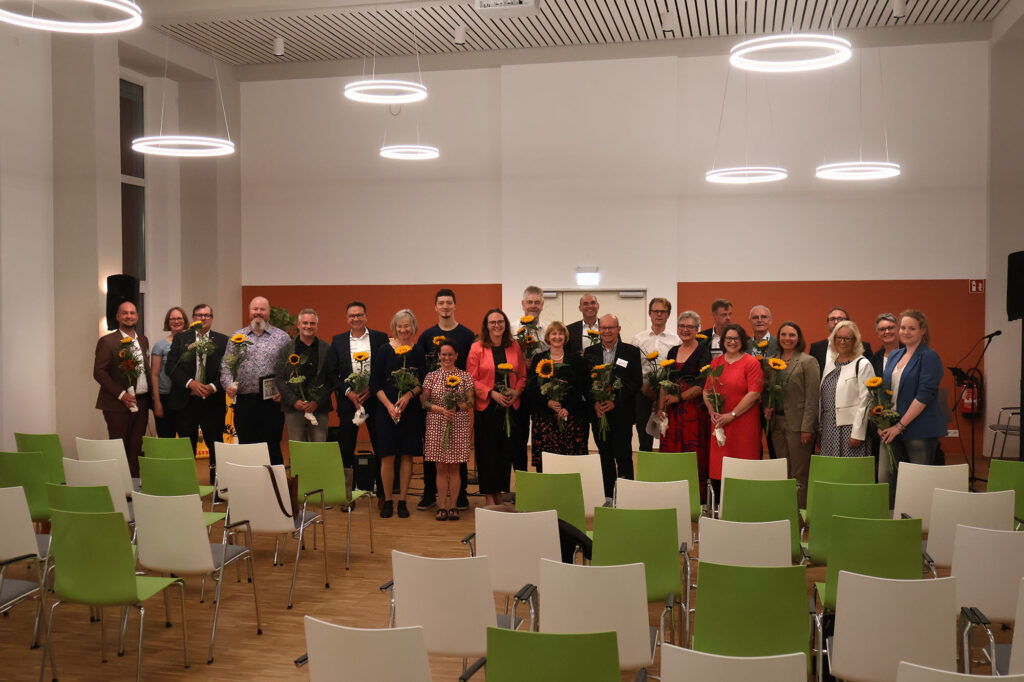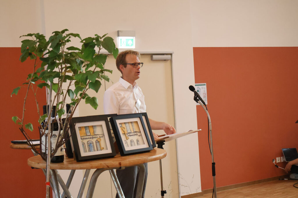 Ein Haus für Alle zu sein – das versprachen für das Johanneshaus beim Festakt auch die Pfarrer Ingo Zöllich und Sebastian Schmidt den Anwesenden, und überreichten dem Bürgermeister, den Architekten, uns als Projektsteuerern und weiteren Akteuren jeweils einen “goldenen Schlüssel zum Haus”. Vom bekannten Troisdorfer Künstler Tor Michael Sönksen, der selbst Gemeindeglied ist, liebevoll gestaltet, soll der Schlüssel als Willkommenssymbol stehen – bei ulrich hartung wird er einen gebührenden Ehrenplatz erhalten.